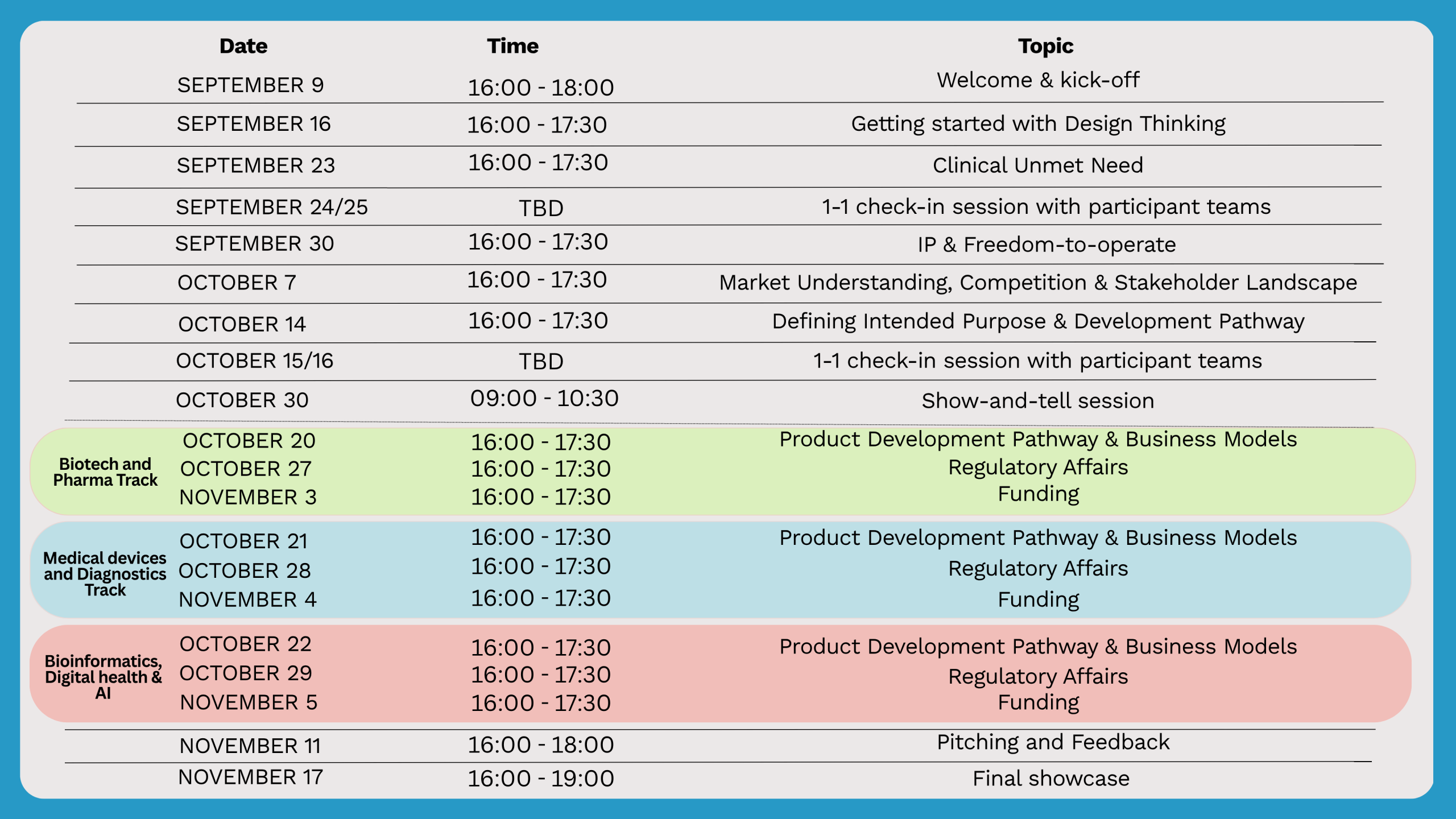 Note: The program kick-off session on 9th Sept’2026 and final Showcase session on 17th Nov’2026 will be on-site only